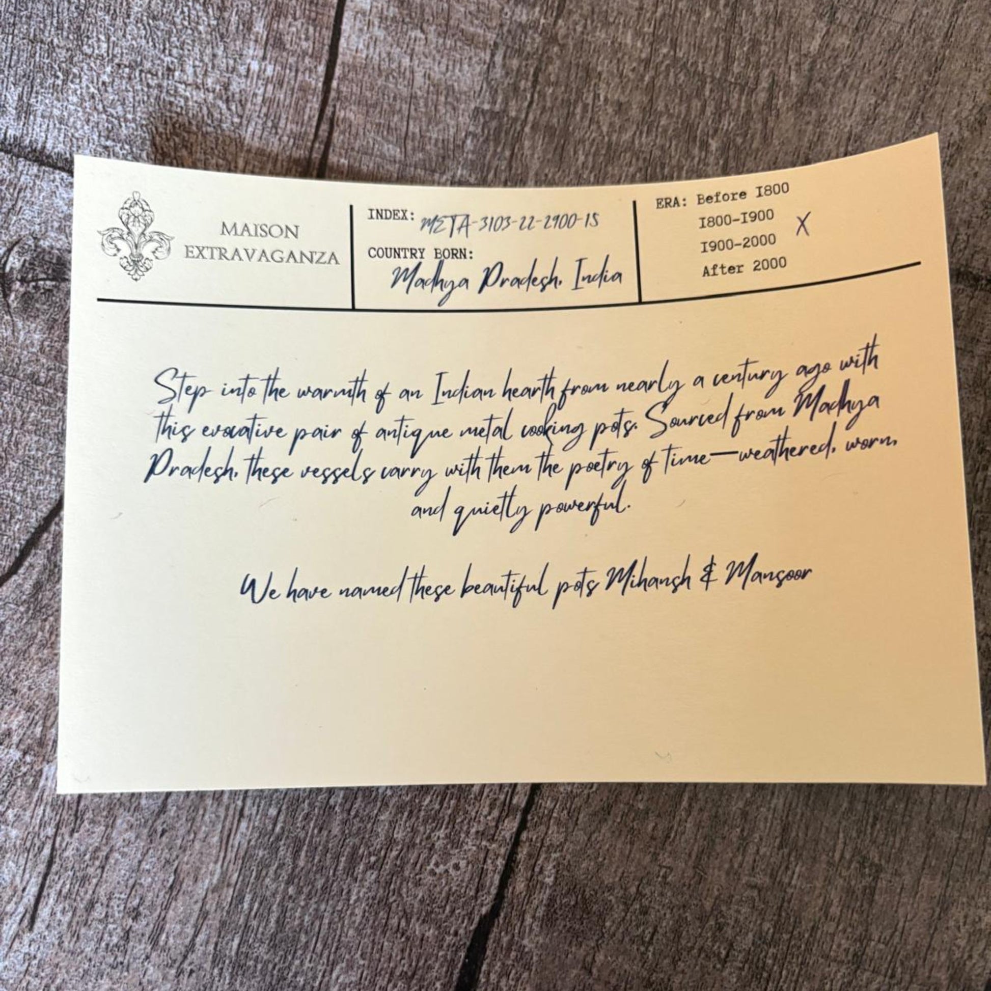 Step into the warmth of an Indian hearth from nearly a century ago with this evocative pair of antique metal cooking pots. Sourced from Madhya Pradesh, these vessels carry with them the poetry of time—weathered, worn, and quietly powerful.