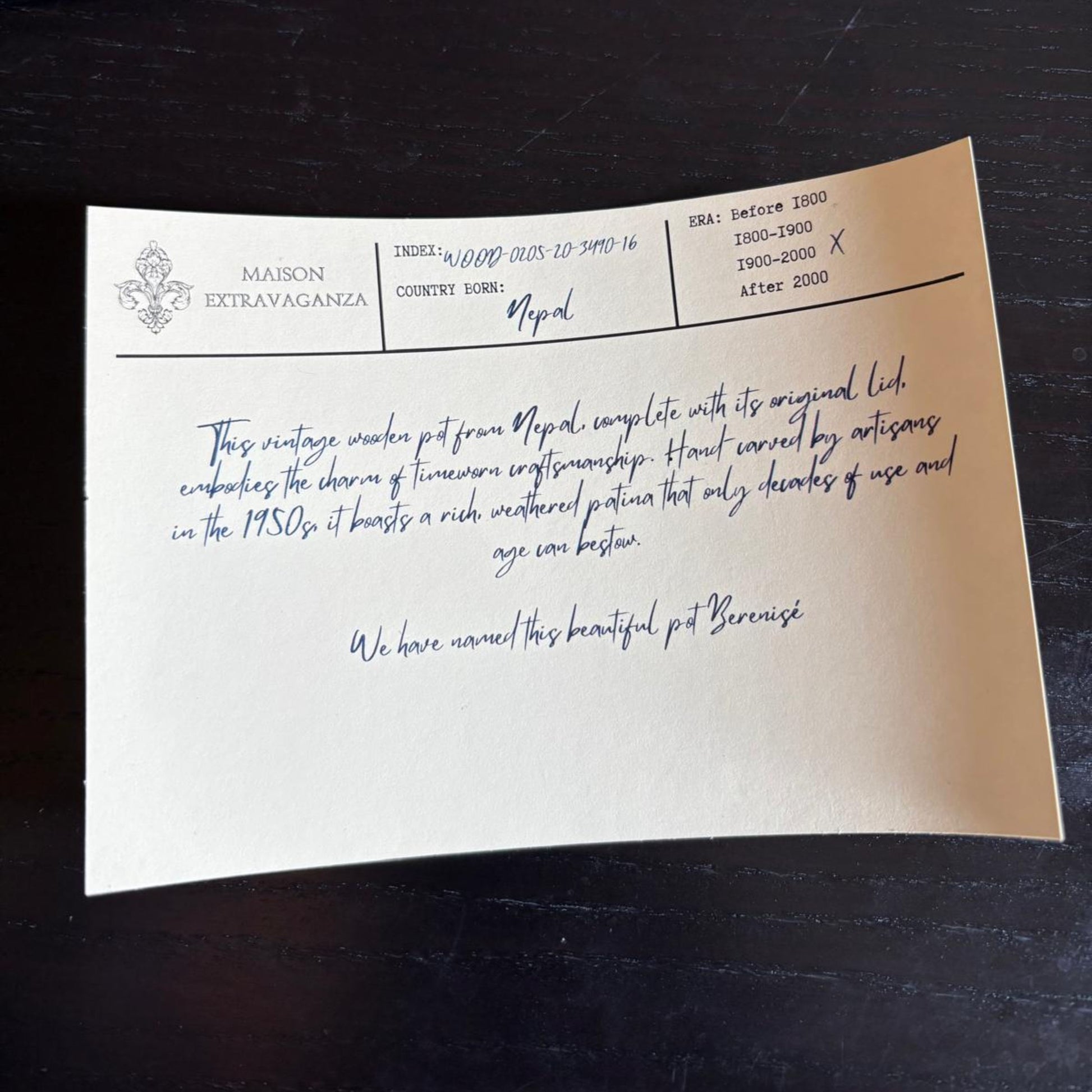 This vintage wooden pot from Nepal, complete with its original lid, embodies the charm of timeworn craftsmanship. Hand-carved by artisans in the 1950s, it boasts a rich, weathered patina that only decades of use and age can bestow. Measuring approximately 16cm high and 20cm wide, it’s a versatile accent that works beautifully as a standalone statement or nestled among curated treasures.